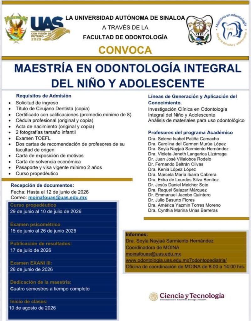 Con el compromiso de atender una de las problemáticas de salud más comunes en la infancia, la Universidad Autónoma de Sinaloa (UAS) lanzó la convocatoria para la Maestría en Odontología Integral del Niño y el Adolescente, un posgrado que destaca por su excelencia académica y pertinencia social.