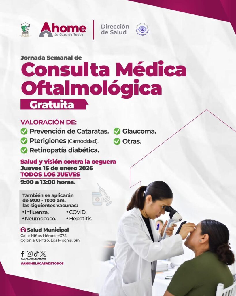 En Ahome, la salud visual es prioridad. El Ayuntamiento, a través de la Dirección de Salud y en coordinación con la organización Visión contra la Ceguera, invita a la ciudadanía a participar en la Consulta Médica Oftalmológica Gratuita